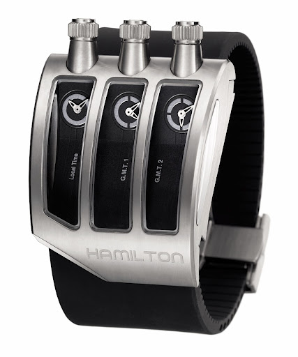 The ODC X-02 from Hamilton looks like something taken from a spy movie. The futuristic design of the watch was modeled after the cross-section of an aircraft wing, with the three pushers representing the blades or the engine of the plane. The watch also features three separate dials that each shows a different time zone.